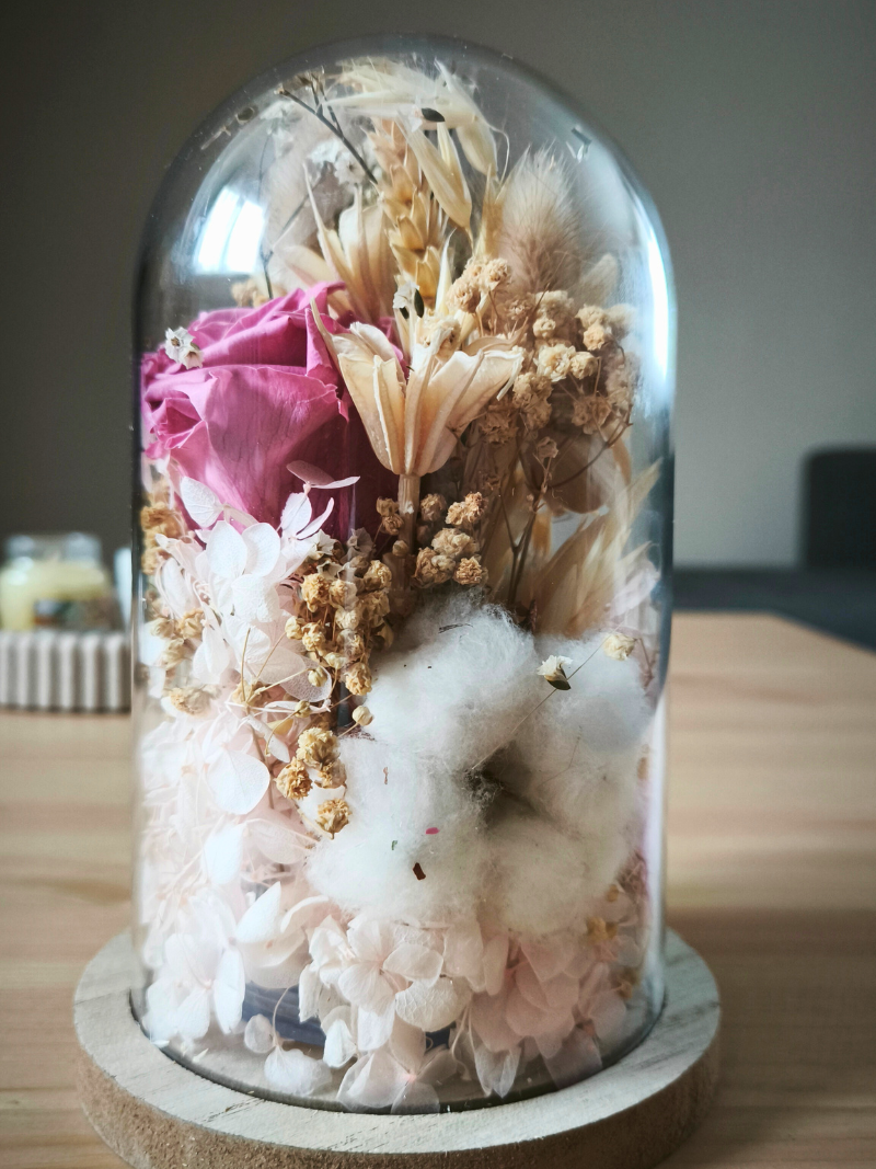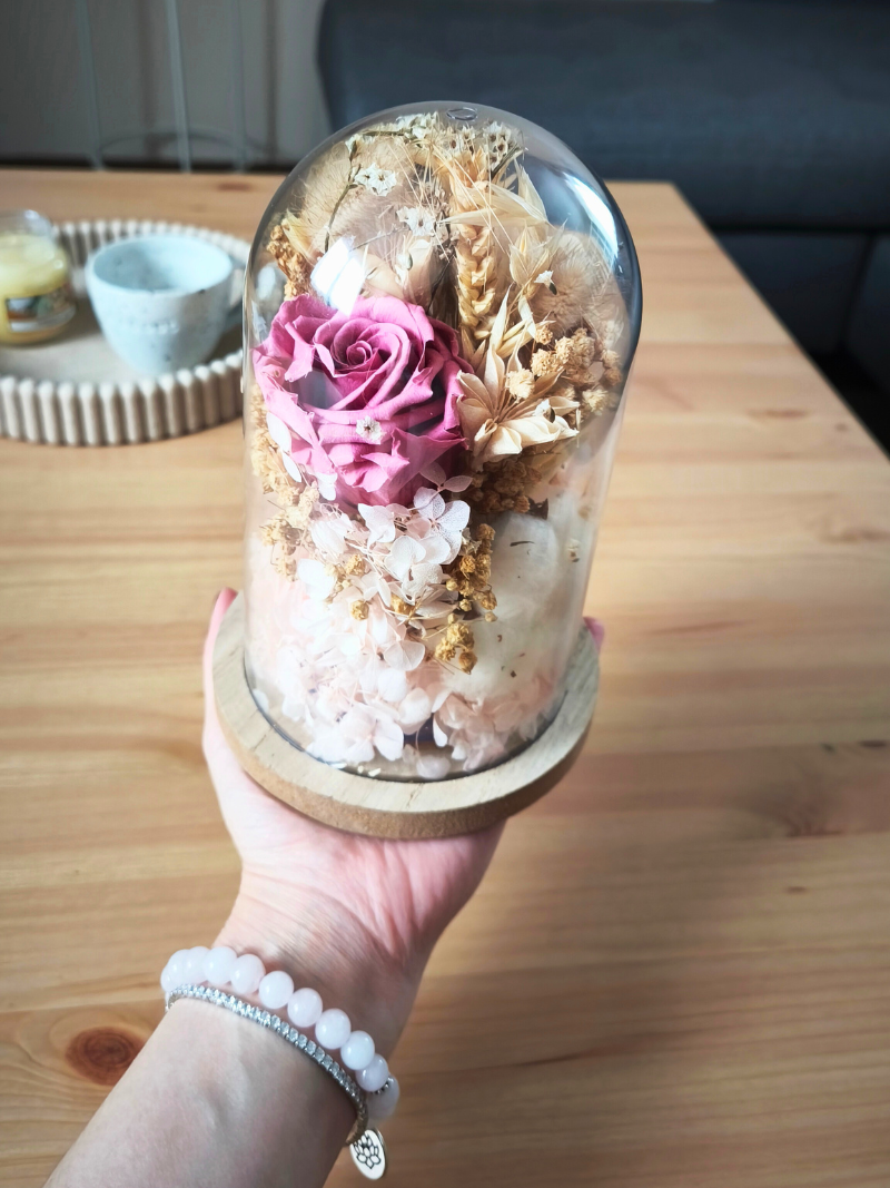 Jemná dekorace podtrhující něžné zimní období. Pod skleněnou kupoli s dřevěným podstavcem jsem naaranžovala sušené a stabilizované květiny, přírodní materiály a zimní detaily, které zjemní váš prostor. Květinová dekorace se může stát tvou kotvou, která tě navrátí do klidu v jinak chaotickém světě. Dopřej si krásu, která neuvadá.