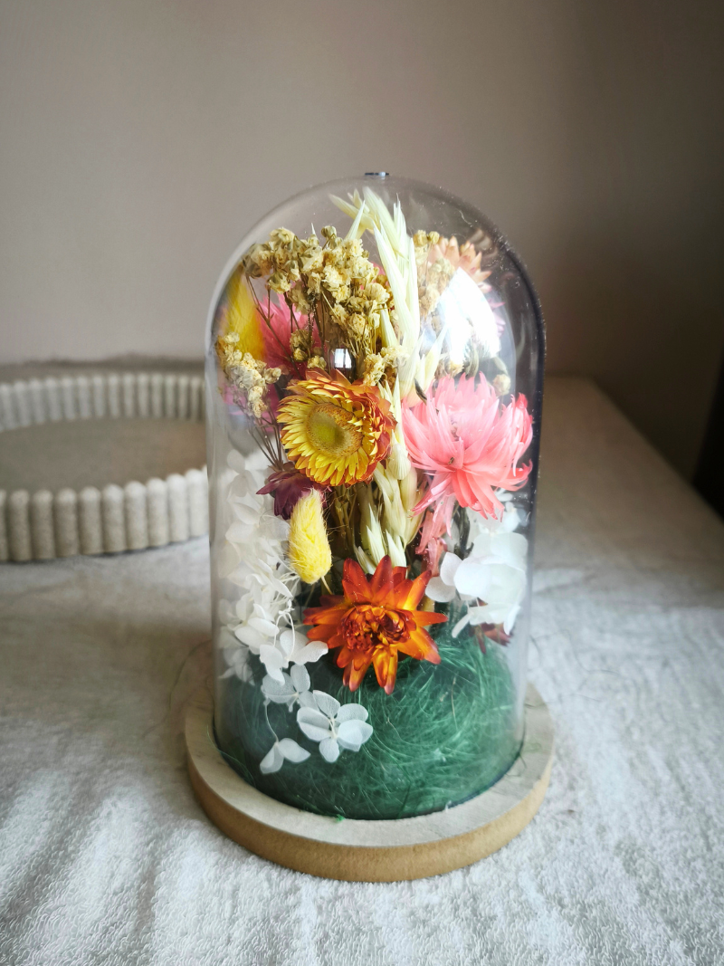 Doporučená péče: udržuj dekorace mimo vlhké prostředí – sušené květiny jsou citlivé na vlhkost, což může způsobit plísně či jejich rozklad. Umísťuj dekorace na suchá, dobře větraná místa. Chraň je před přímým slunečním zářením – dlouhodobé vystavení světlu může změnit barvu sušených květů. Umísti dekorace na místa, kde nejsou vystaveny intenzivnímu světlu.