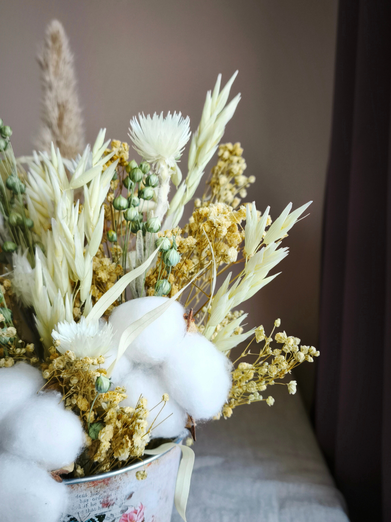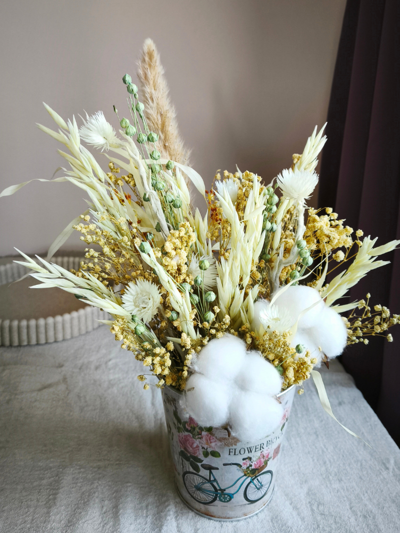 Jemná květinová dekorace ze sušených a stabilizovaných rostlin naaranžovaná v plechové nádobě. Působí lehkým dojmem a vnáší do prostoru klid.
